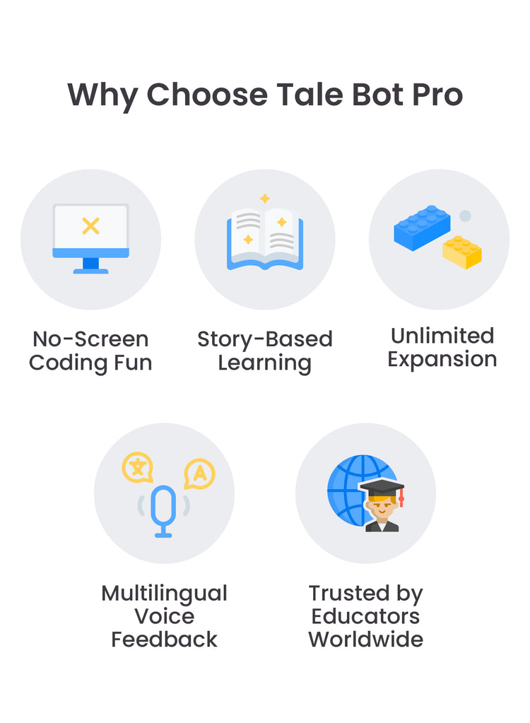 Der Roboter wird mit umfangreichen Erweiterungspaketen, Aktivitätsmatten und Geschichtenerzählkarten geliefert, sodass Kinder das Programmieren durch Spiele, Lieder und fantasievolle Abenteuer erlernen können. Durch die Kombination von MINT-Ausbildung mit Kreativität und Geschichtenerzählen macht Tale-Bot Pro das Programmieren unterhaltsam, fesselnd und entwicklungsgerecht für Vorschul- und Grundschulkinder.